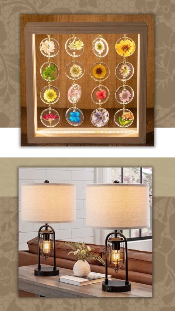Why hide pressed flowers in a book when you can make them glow? This lamp features delicate, real botanical specimens encased in resin “charms,” suspended within a minimalist wooden frame. It’s part lighting, part herbarium, and entirely magical.